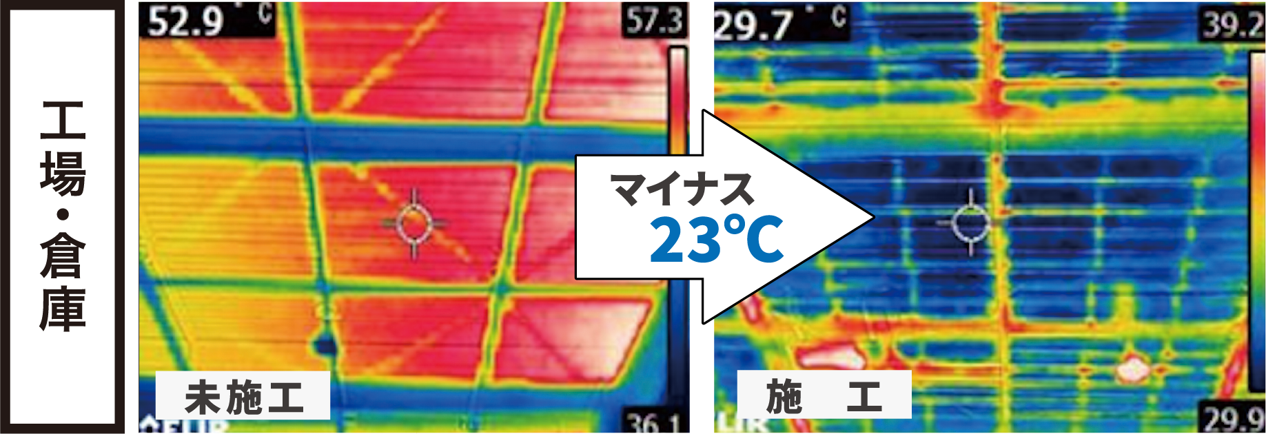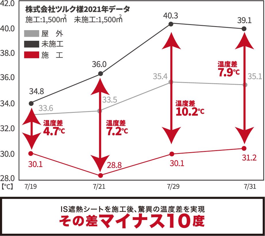 ※屋根下にIS遮熱シートを施工6月〜9月(8時間/日)で計測。